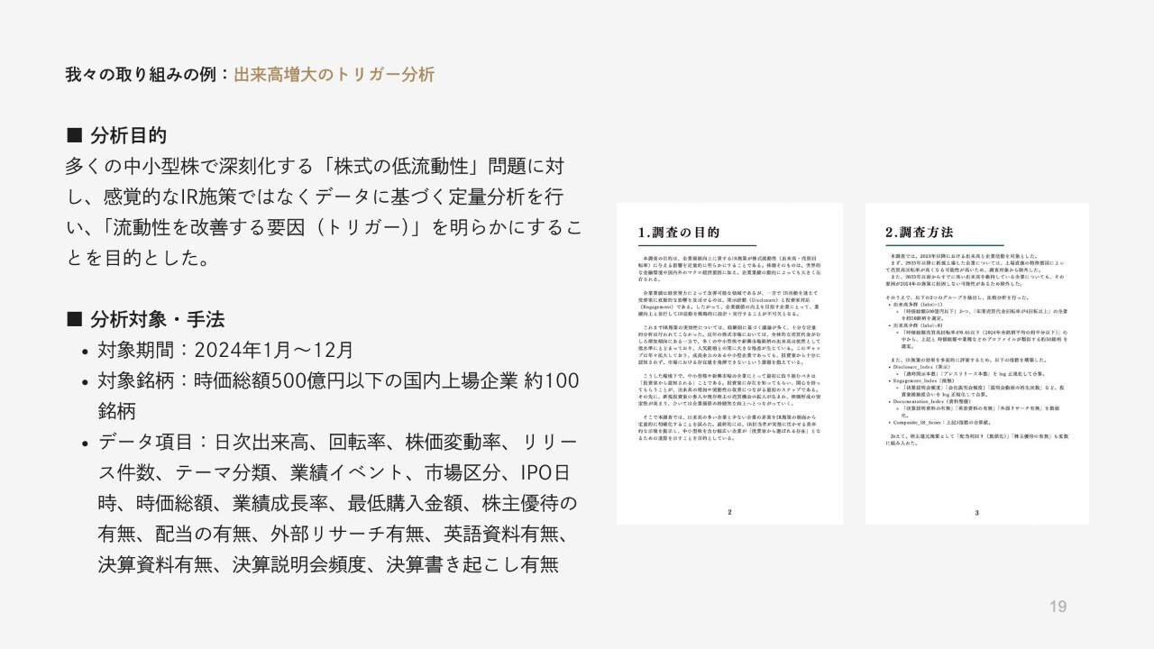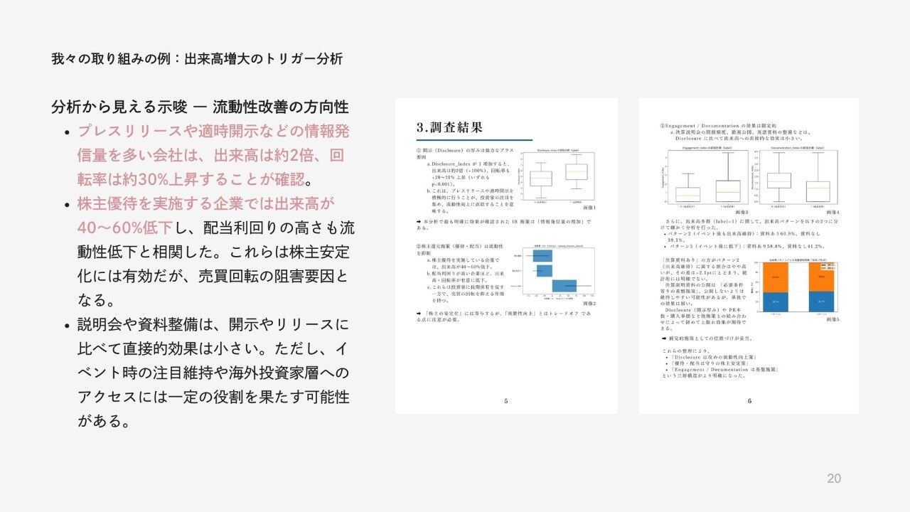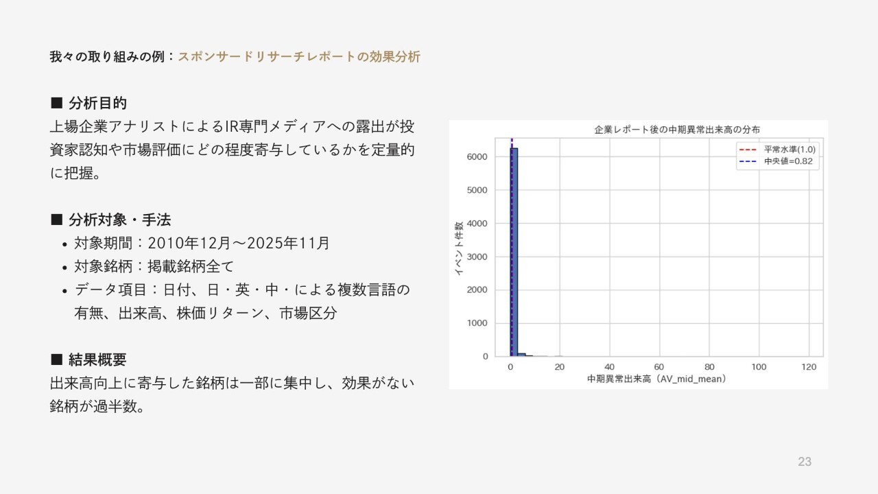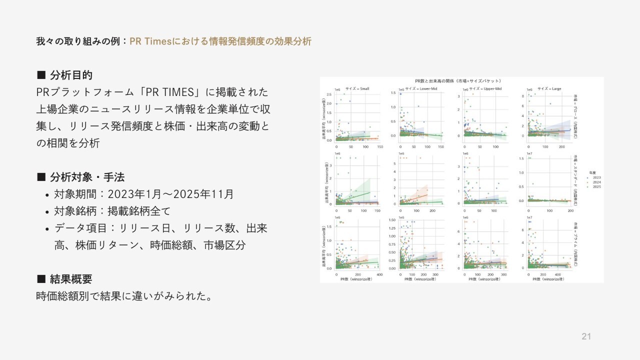 特有の企業の効果のようなものがあり、今後はここをきちんと分離して分析していかなければならないため、断定的にお話しできることはないのですが、このラインの企業でも今後IRに力を入れていくことを考えるのであれば、その上のレイヤーの発信をし、出来高に寄与するような活動をしていく必要があるのではないかと思います。
