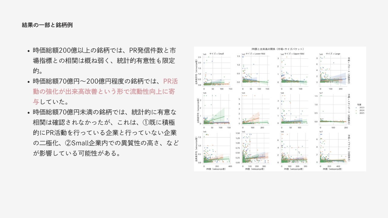 齊藤:先ほどの出来高要因と似たような結果は得られましたが、こちらはあくまで時価総額別に分けて見たものです。結論からいうと、一番ポジティブな部分に関しては、時価総額が70億円から200億円ぐらいはリリースの数と、出来高に相関がありました。もちろんこれも因果ではありません。