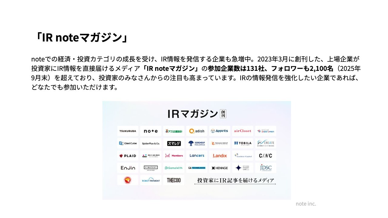 徳力:IRの情報発信は、実はnoteが力を入れる前から企業の方々に始めていただいた歴史があります。IR利用の高まりを受けて『IR noteマガジン』というものも運営しており、こちらはすでに100社以上が参加しており、フォロワーも2,000名を超える企業のIR情報発信の場所となっています。