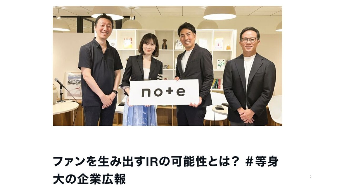 後藤:だいたいそのような流れで、来期業績予想は後ろのほうに入っていて「いや、最初に出そうよ」と思うこともあります。その時に、「note」で関心がありそうなテーマを個別に出すのは非常に有効だと思います。