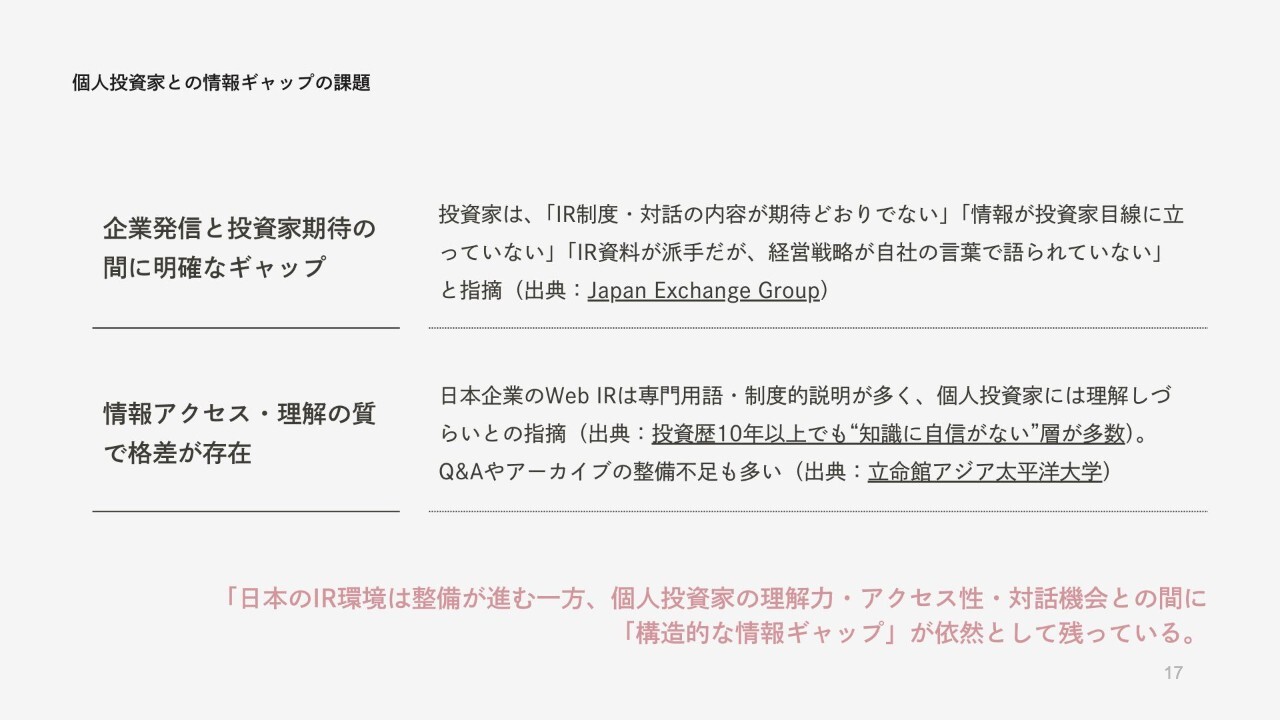 そうではなく、投資家の方々が今必要としている情報が、実はオンライン上にないのではないかという問題意識から、まずはオンライン上に情報がある状態を作っていこうということですね。