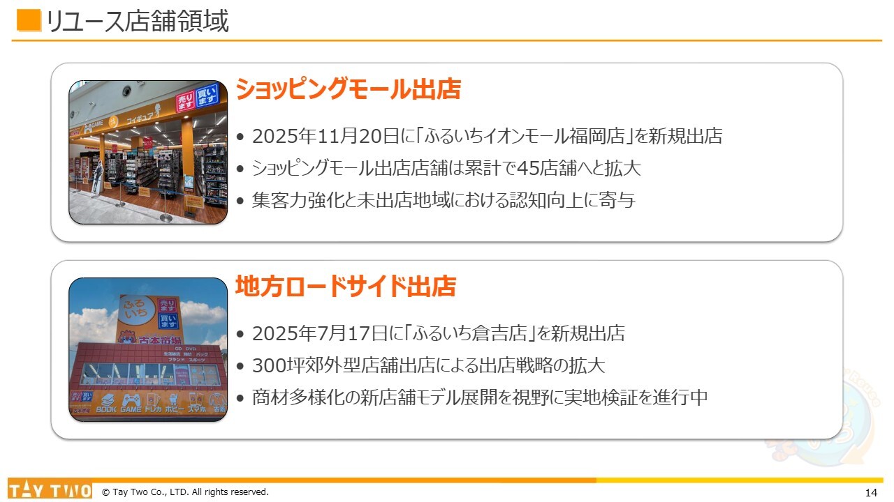 まず、リユース店舗領域です。ショッピングモールへの出店に関しては、11月20日に「ふるいちイオンモール福岡店」を新規出店しました。これにより、ショッピングモールの出店店舗数は累計で45店舗に拡大しました。