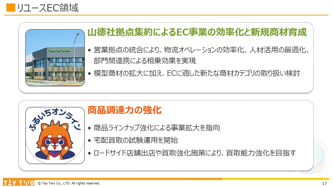 リユースEC領域です。子会社の山徳社については、決算のB/S勘定にも反映されていますが、新拠点で安定的な経営成績を維持しています。