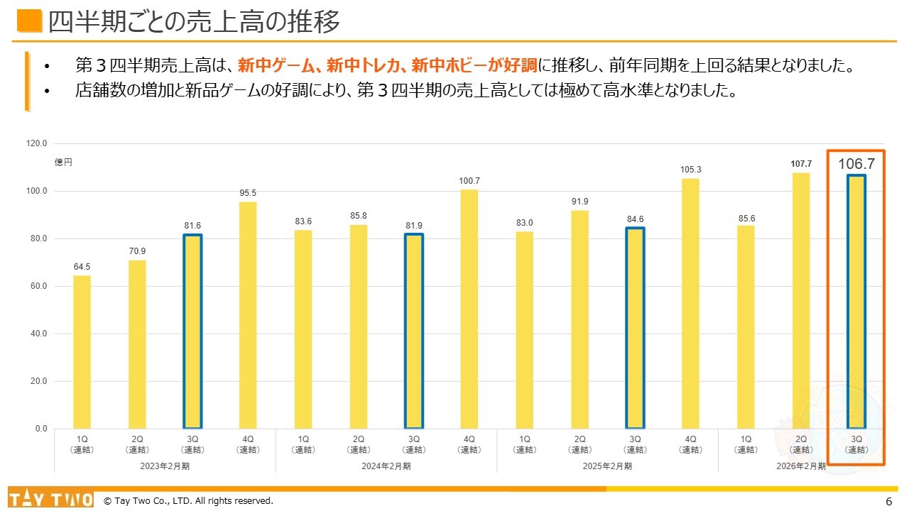 四半期ごとの売上高の推移です。「新品・中古(以下、新中)ゲーム」「新中トレカ」「新中ホビー」が好調に推移し、前年同期を上回る結果となりました。また、店舗数の増加と新品ゲームの好調により、第3四半期の売上高としては極めて高水準となっています。