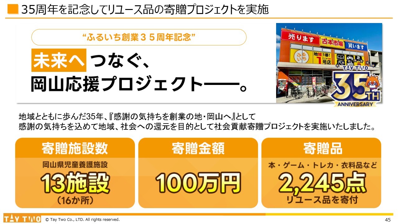 「未来へつなぐ、岡山応援プロジェクト」と題し、地域とともに歩んだ35年ということで、創業の地である岡山への感謝の気持ちを込め、地域社会への還元を目的とした社会貢献寄贈プロジェクトを行いました。具体的には、岡山県内の児童養護施設13施設に対し、寄贈金額100万円とリユース品2,245点を寄贈しました。