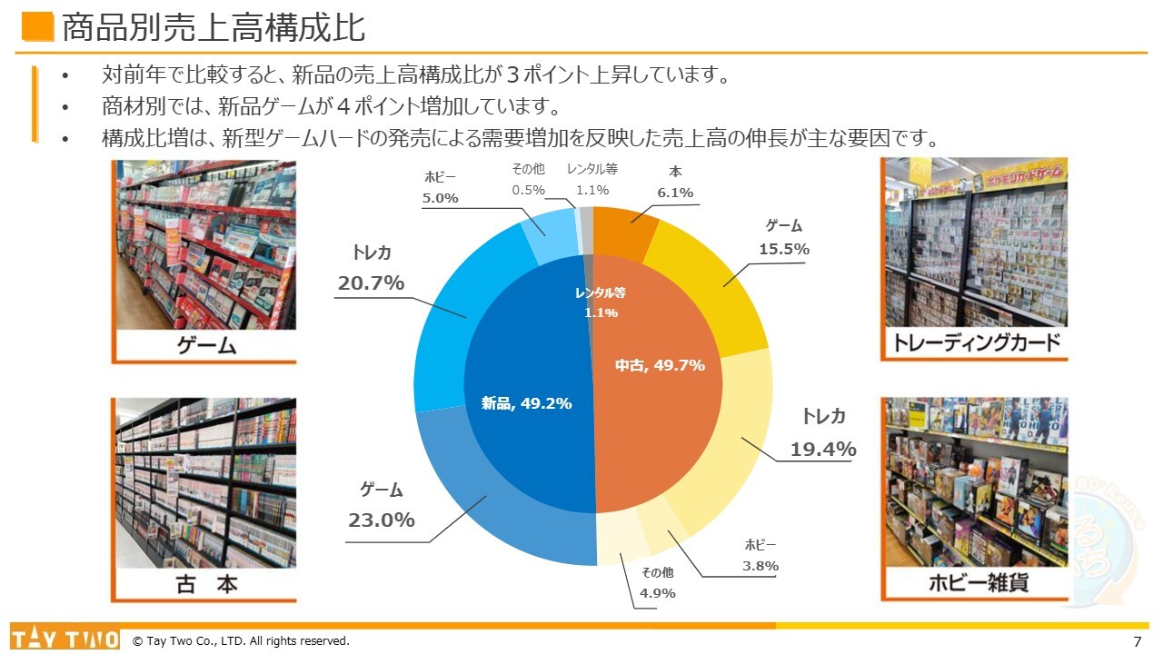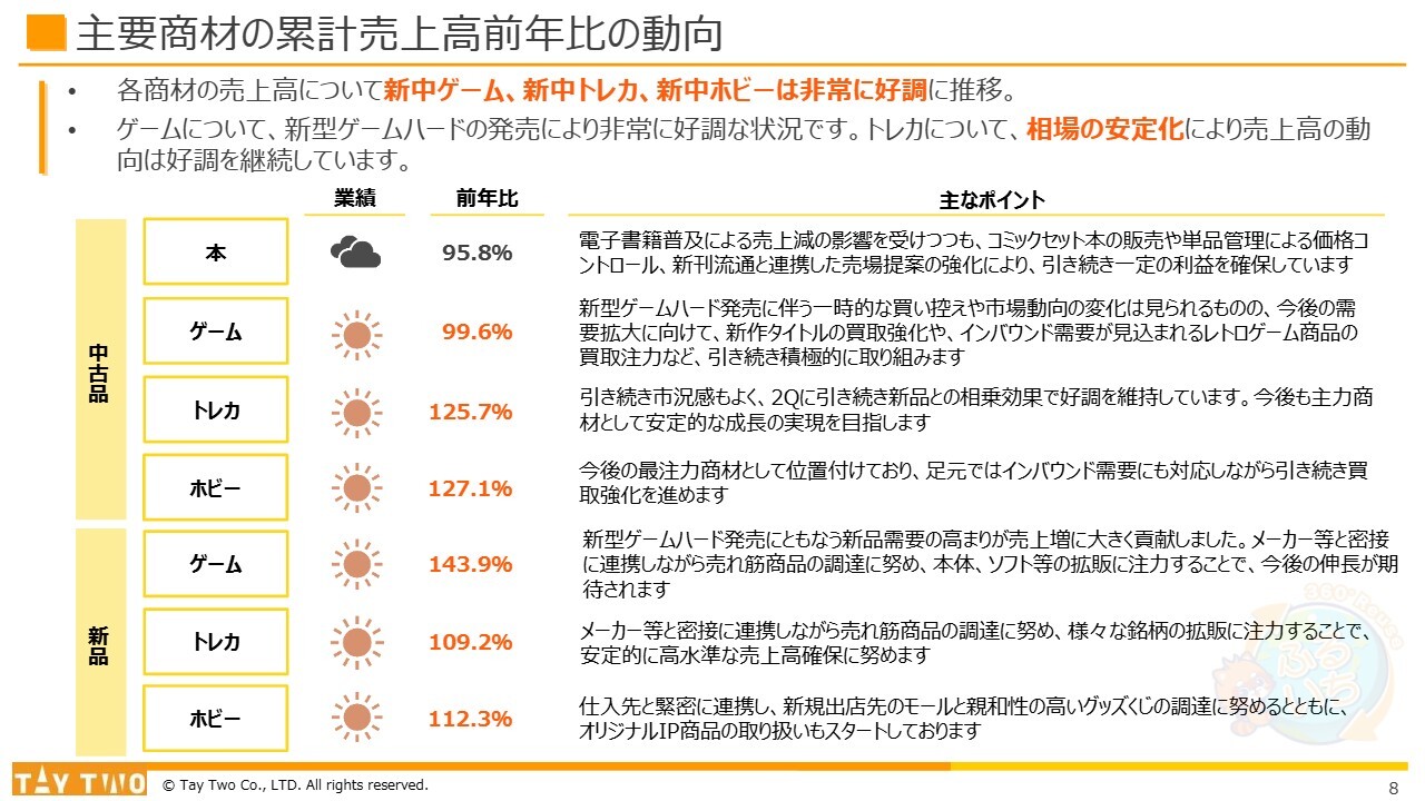 ゲームについては、新型ゲームハードの発売により、非常に好調な状況です。トレカについては、相場の安定化により売上高の好調が継続しています。