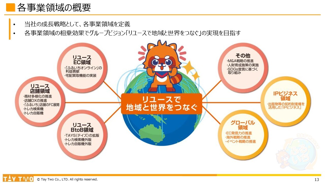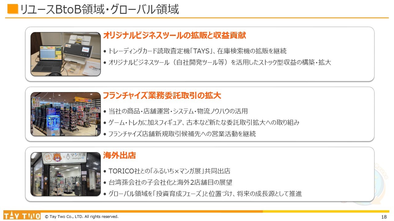 リユースのBtoB領域およびグローバル領域です。オリジナルビジネスツールの拡販と収益貢献として、トレーディングカードの自動読取査定機「TAYS(テイズ)」は市況が安定していることから、引き合いも引き続き堅調に積み上がっています。来期以降の営業施策を見すえて、より多くの事業者さまにツールを活用していただくための展開を進める計画です。