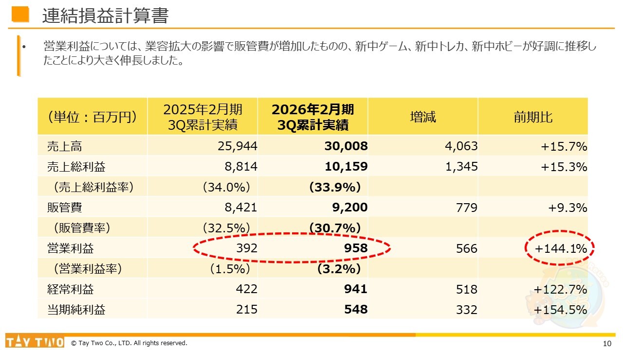連結損益計算書です。業容拡大に伴い販管費が増加したものの、新中ゲーム、新中トレカ、新中ホビーが好調に推移したことで、営業利益は大きく増加しています。