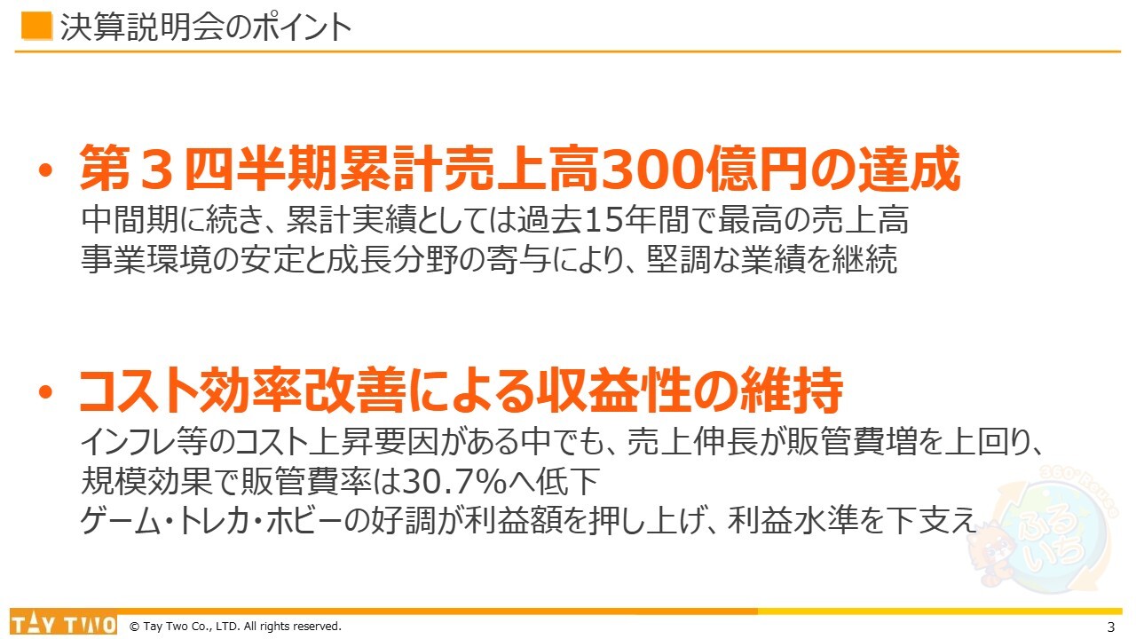 第3四半期累計の売上高は300億円を達成しました。また、コスト効率の改善により収益性を維持しています。