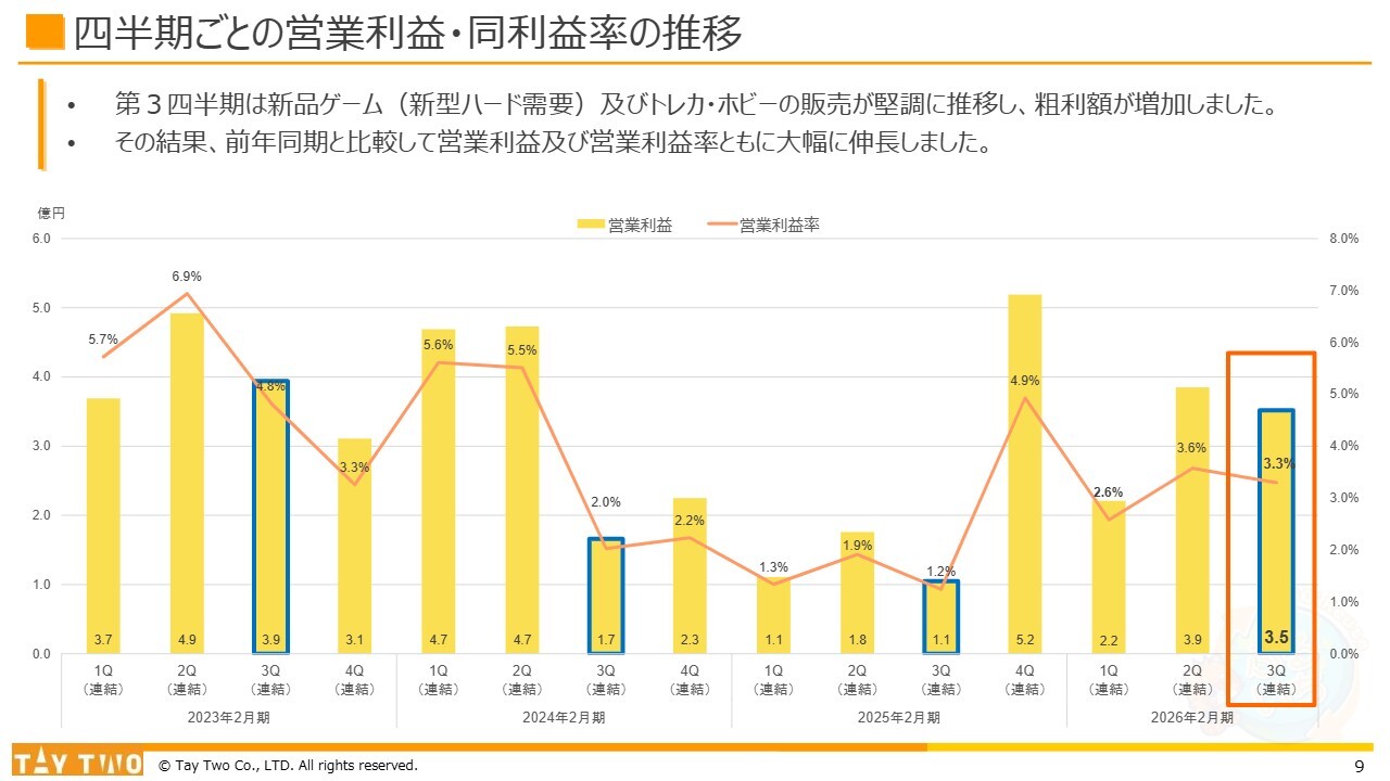 四半期ごとの営業利益および営業利益率の推移です。新品ゲームやトレーディングカード・ホビーの販売が堅調に推移し、粗利額が増加しました。その結果、前年同期と比較して、営業利益および営業利益率のいずれも大幅に伸びました。