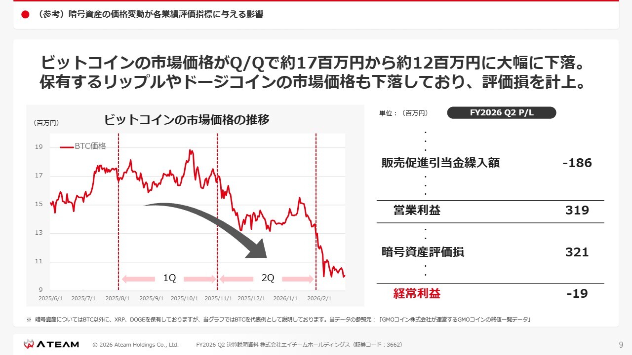 スライドのグラフに示されているように、ビットコインの市場価格はFY2026第1四半期から第2四半期にかけて、約1,700万円から約1,200万円に下落しています。暗号資産価格の下落に伴い、販売促進引当繰入額がマイナス1億8,600万円と営業内費用が減少し、営業利益は3億1,900万円となります。それに対して、暗号資産評価損3億2,100万円が計上されます。その結果、経常利益としてはマイナス1,900万円となっています。