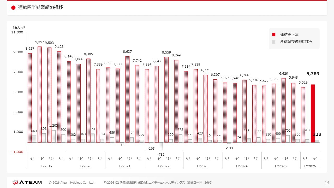 連結四半期業績の推移です。FY2025あたりから四半期ごとの利益を意識した結果、FY2026も黒字を達成しています。
