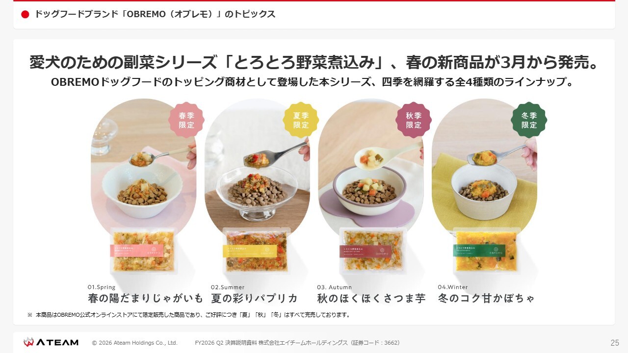 メイン商材はOBREMOドッグフードとして、一般的にいう「カリカリ」といわれるタイプですが、新商品として野菜を中心とした「とろとろ野菜煮込み」というトッピング商品を発売しました。「カリカリ」に対して「とろとろ」というサービスコンセプトとなっていまして、季節ごとに野菜の種類を変えて、既存の「カリカリのフード」と「とろとろのトッピング」を併売するかたちで提供しています。