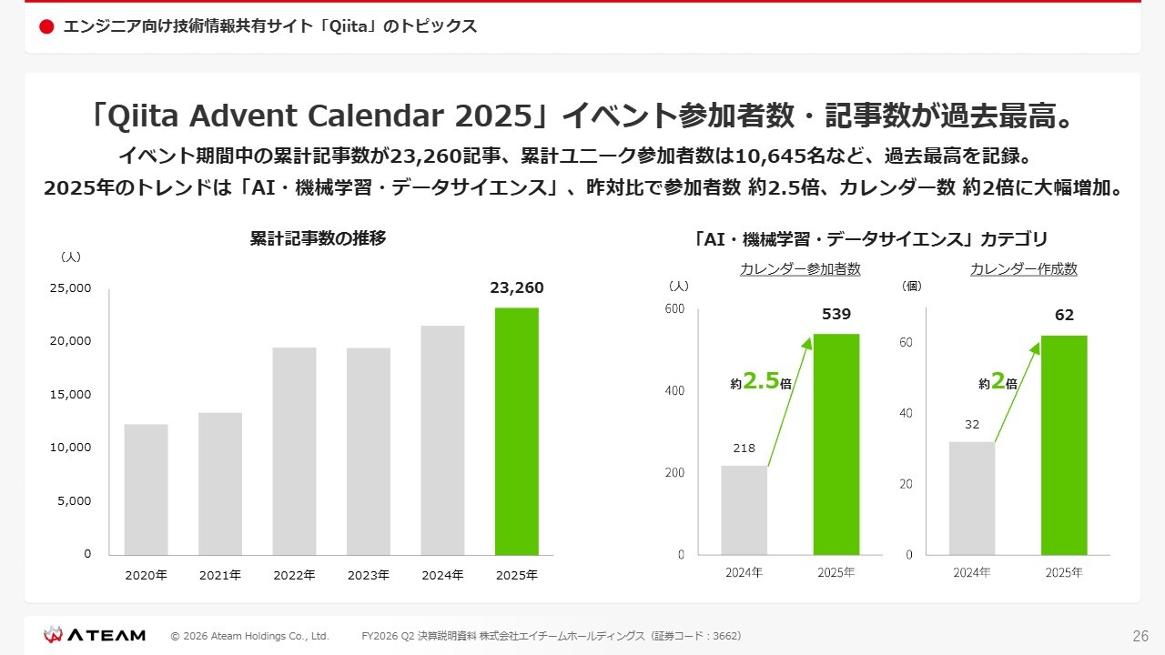 「Qiita」では、毎年、クリスマスに向けてさまざまな記事を投稿するイベントとして「Qiita Advent Calendar」を開催しています。クリスマスの季節になりますと、多くのユーザーのみなさまがさまざまな記事を投稿します。このイベントの累計ユニーク参加者数が1万645名、記事投稿数が2万3,260記事と、ともに過去最高を記録しています。2025年のトレンドとしてはAI、機械学習、データサイエンスといった内容が多かったです。当該カテゴリにおいて、昨対比で参加者数は約2.5倍、カレンダー数は約2倍と、トレンドを示すとおりの伸びを示しています。
