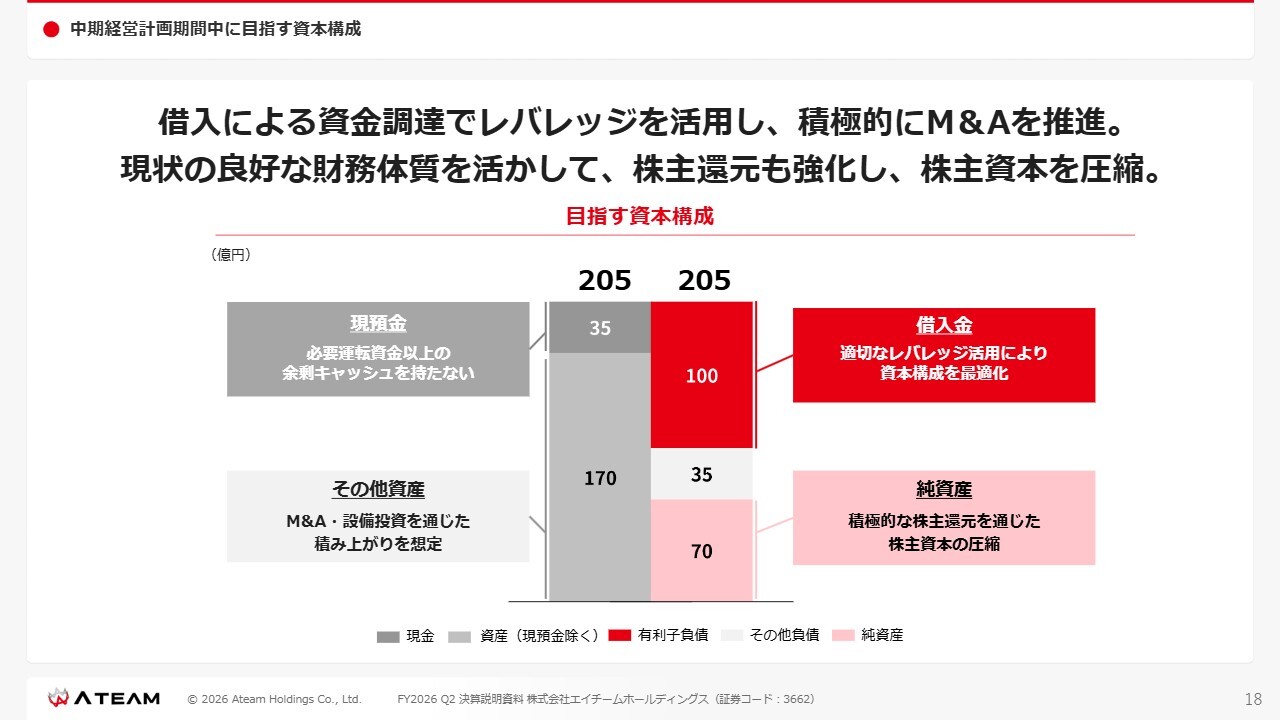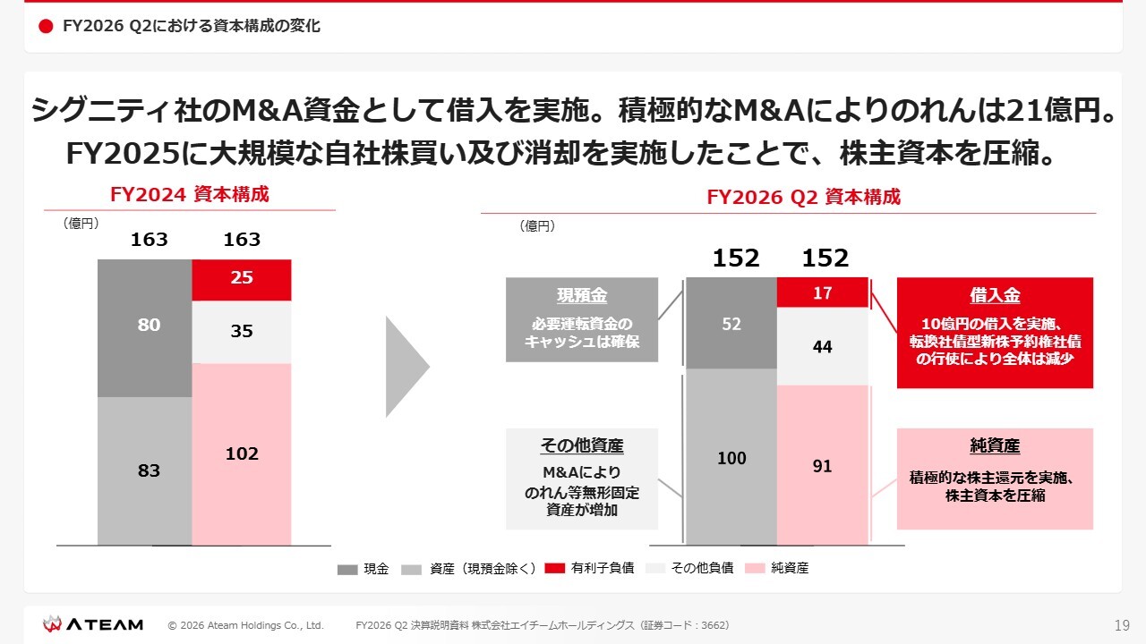 このスライドの左側がFY2024におけるB/Sでしたが、2025年11月20日に実行したシグニティ社のM&Aに伴い、約10億円の借入れを実施したことで、右側のFY2026第2四半期資本構成として記載のとおりの状況となっています。引き続き、先ほどの資本政策に基づいて、遂行していこうと考えています。