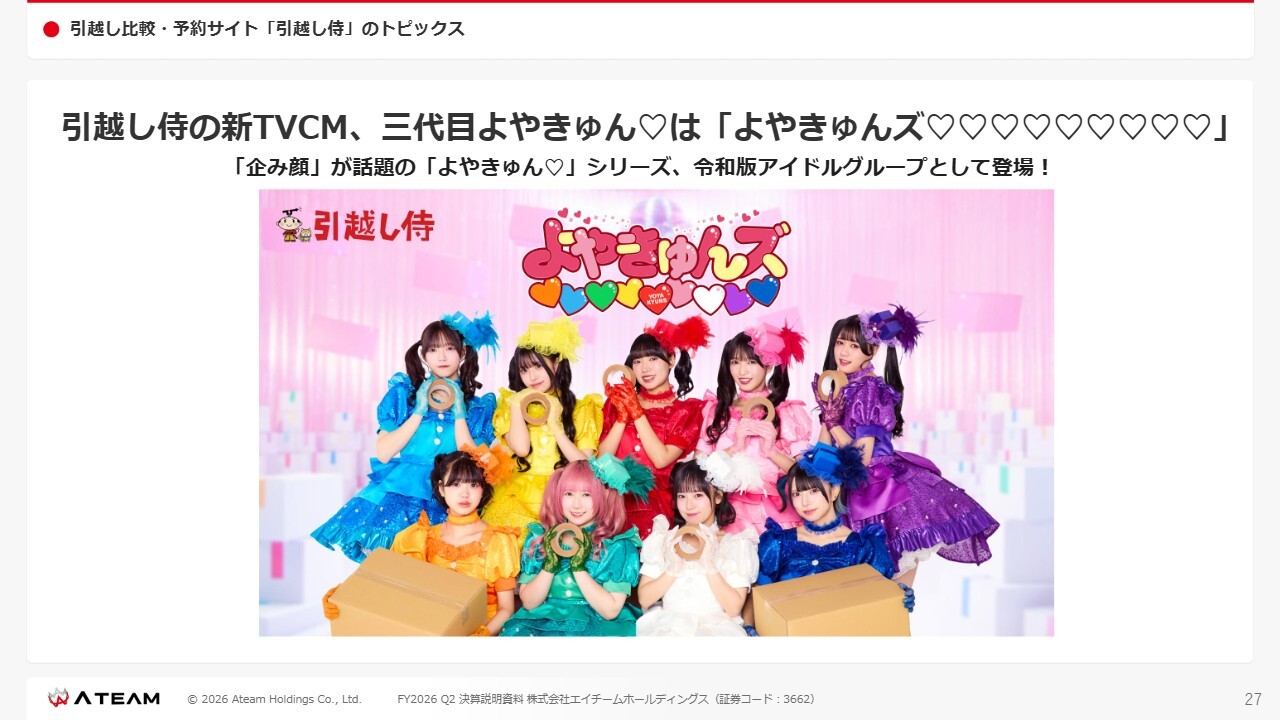 「引越し侍」のトピックスとしては、「引越し侍」の新テレビCMを放映開始しました。「引越し侍」はプロモーションとして「よやきゅん♡」というアイドルがCMに登場します。これまで、1代目、2代目はソロアイドルとして「よやきゅん♡」でしたが、今回の新テレビCMの3代目では、令和版アイドルグループ「よやきゅんズ♡♡♡♡♡♡♡♡♡」として登場しました。