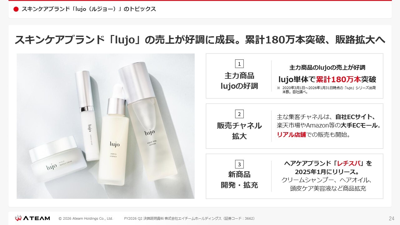 デジタルマーケティング事業のトピックスです。D2C事業のビジネスになりますが、スキンケアブランド「lujo(ルジョー)」の売上が好調に成長しています。累計で180万本を突破しました。
