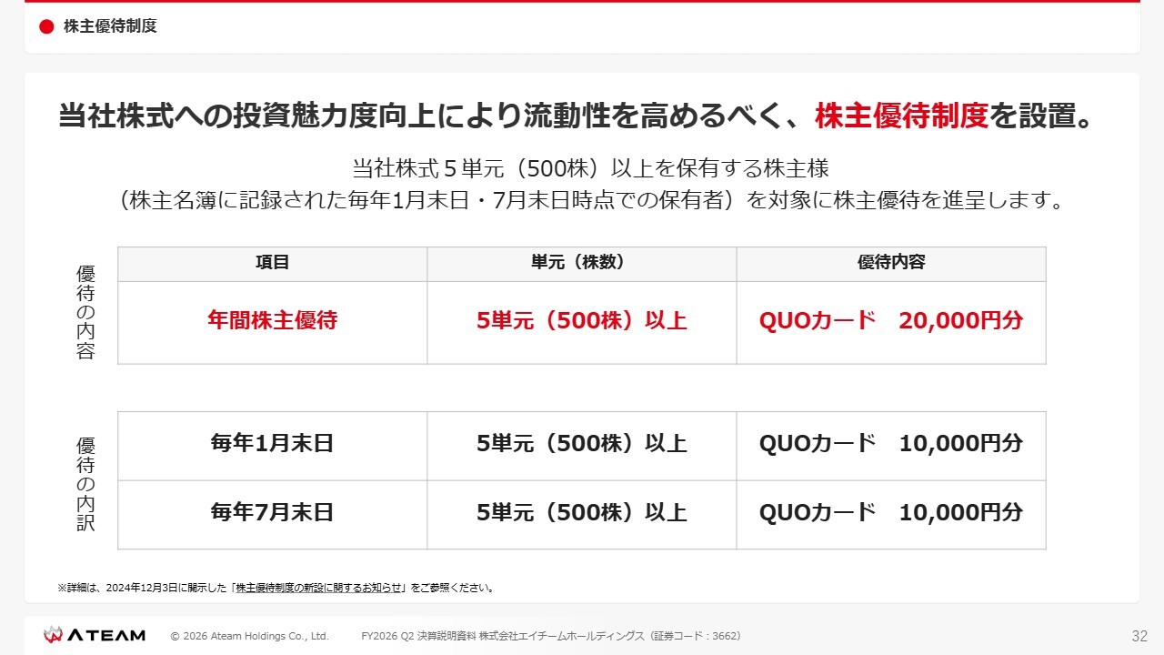 株主優待についてです。当社は、5単元(500株)以上をお持ちの株主さまには年に2回、QUOカードを1万円分ずつ、合計2万円分を優待として進呈しています。