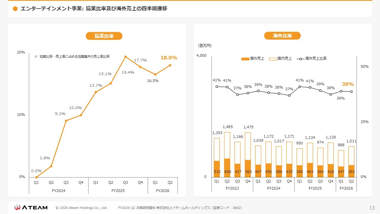 スライド左側のグラフは売上高に対する協業案件の売上高比率を示したもので、現在は18パーセントとなっています。右側のグラフは売上高の海外比率で、現在39パーセントとなっています。