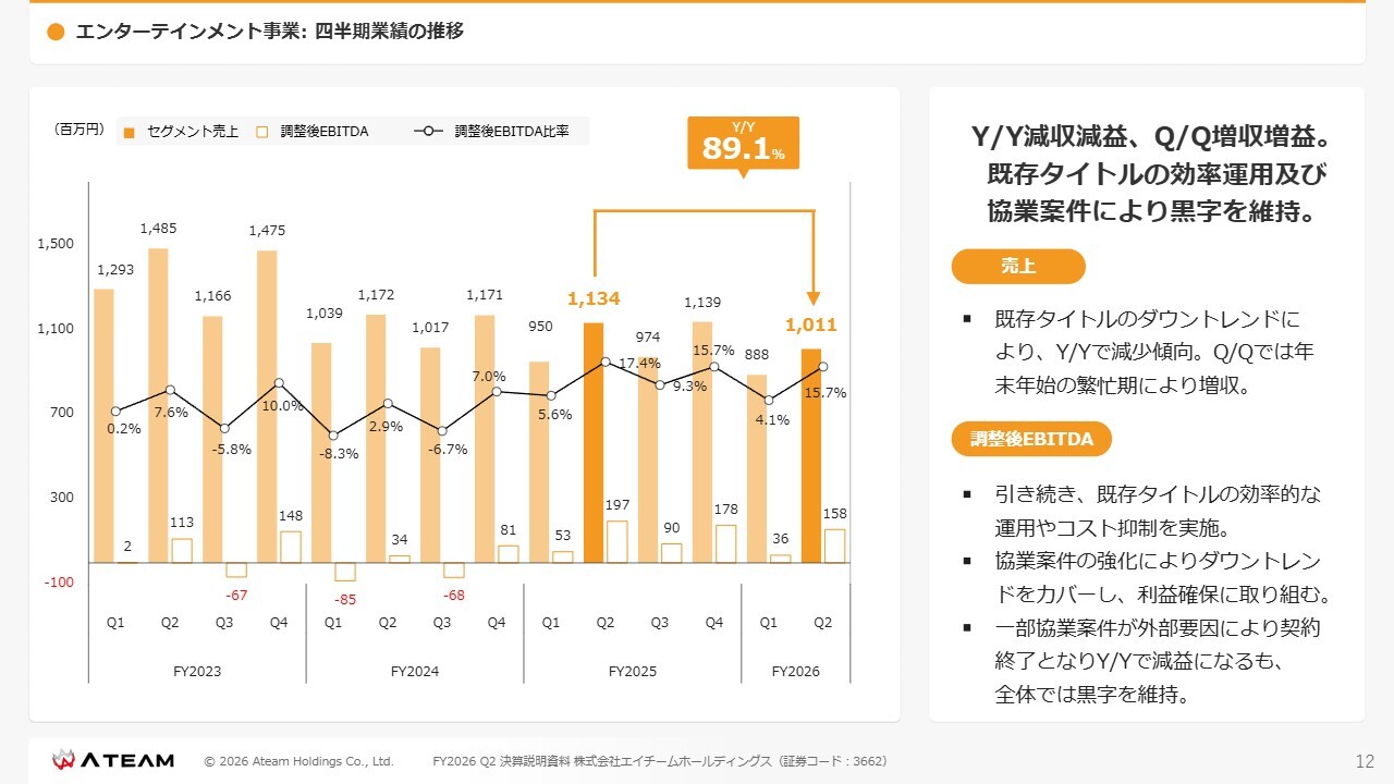 エンターテインメント事業の四半期業績の推移です。既存タイトルのダウントレンドにより、前年同期比では減収傾向となりましたが、前四半期比では年末年始の繁忙期の影響で増収となりました。