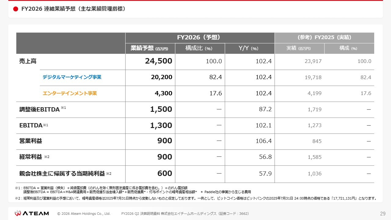FY2026の業績・配当予想です。売上高245億円、調整後EBITDA15億円ということで、予想としては据え置きとさせていただいています。