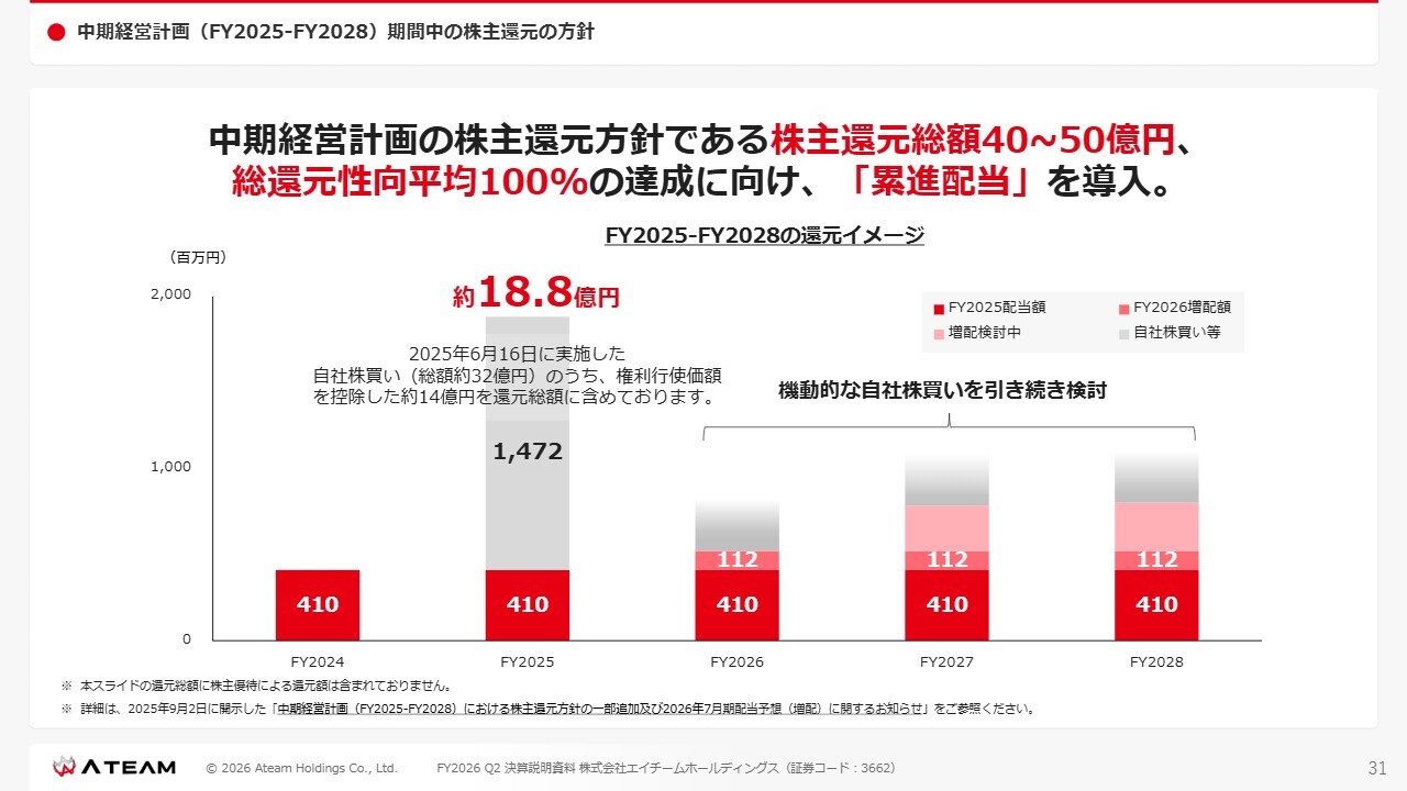 以前からご説明させていただいていますが、中期経営計画の株主還元方針である「株主還元総額40億円から50億円」および「総還元性向平均100パーセント」の達成に向け、累進配当を導入しています。グラフの右側にも記載していますが、引き続き機動的な自社株買いなども検討しています。