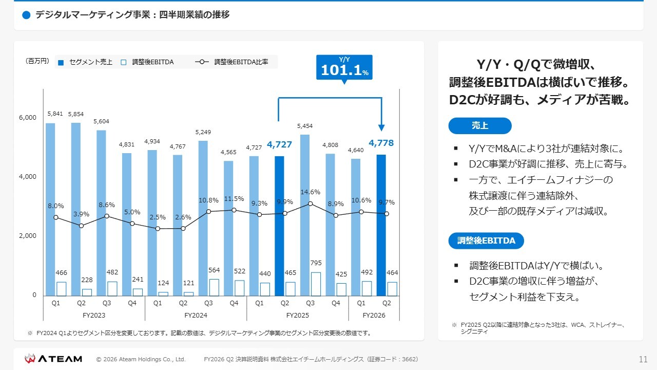 調整後EBITDAは、スライドに記載のとおり前年同期比で横ばいとなりました。D2C事業の増収に伴う増益がセグメント利益を下支えしています。