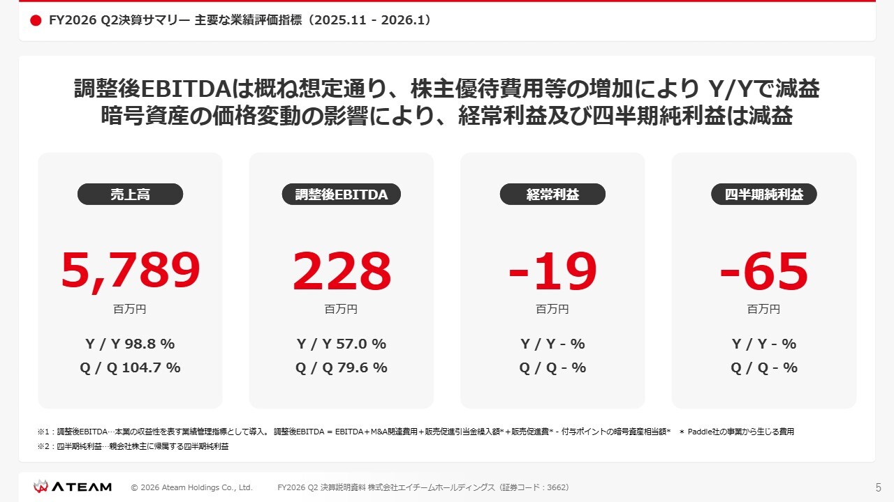 FY2026 Q2決算サマリー 主要な業績評価指標(2025.11 - 2026.1)