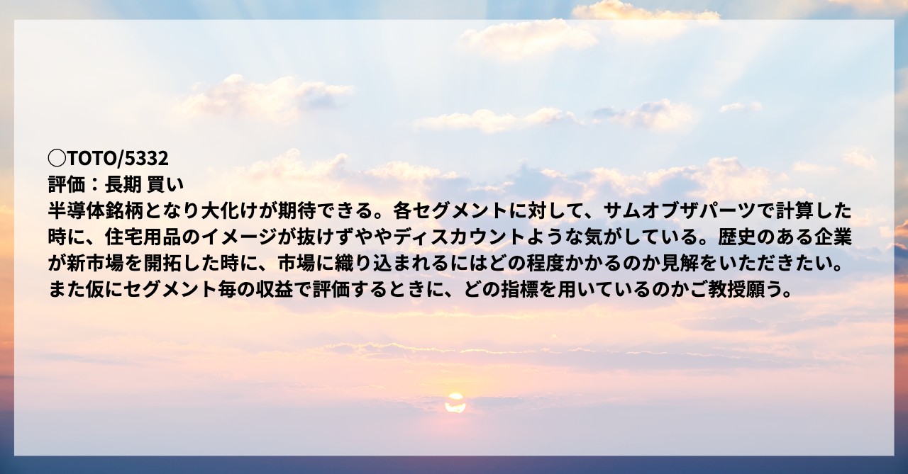 「半導体銘柄となり大化けが期待できます。各セグメントに対してサムオブザパーツで計算した時に、住宅用品のイメージが抜けず、ややディスカウントのような気がしています。歴史のある企業が新市場を開拓した時に市場に織り込まれるにはどの程度かかるか、見解をいただきたいです。また仮にセグメントごとの収益で評価する時に、どの指標を用いているのかご教示願います」というご質問です。