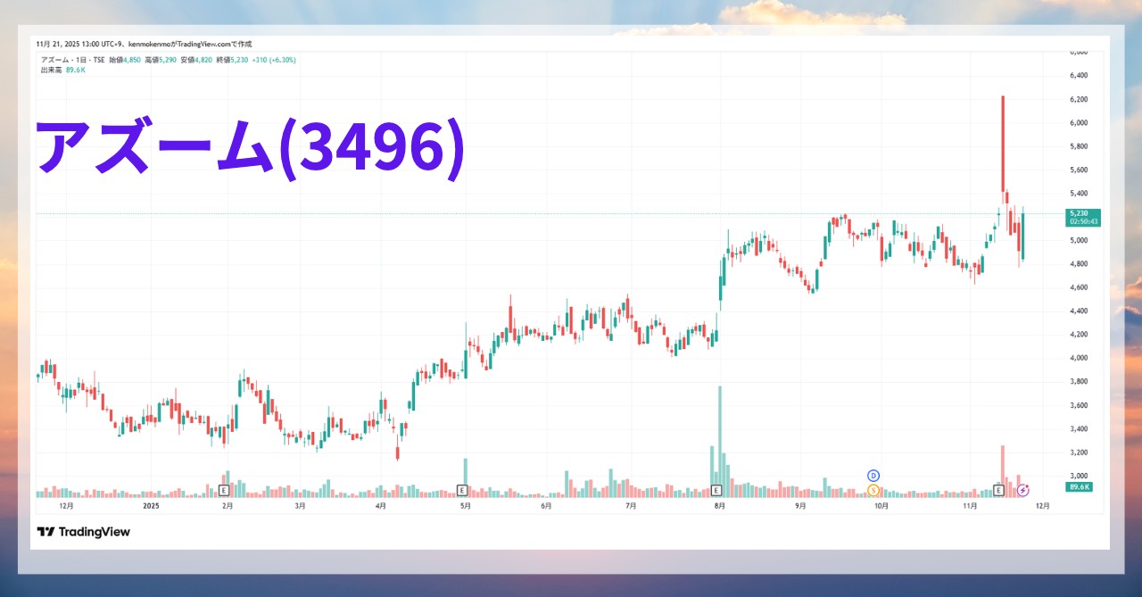 例えば、アズームは業績がずっと堅調で、今回も非常に強気の中期経営計画を出したのですが、発表の翌営業日に大きくギャップアップして上げたものの、その後は大陰線で一気に値を消してしまいました。昨日は少しリバウンドのような動きがありましたが、ほぼ全戻しという印象のチャートになっています。