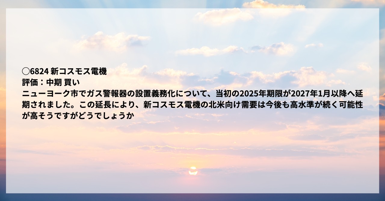 「ニューヨーク市でガス警報機の設置義務化について、当初の2025年期限が2027年1月以降へ延期されました。この延長により新コスモス電機の北米向け需要は今後も高水準が続く可能性が高そうですが、どうでしょうか?」というご質問です。