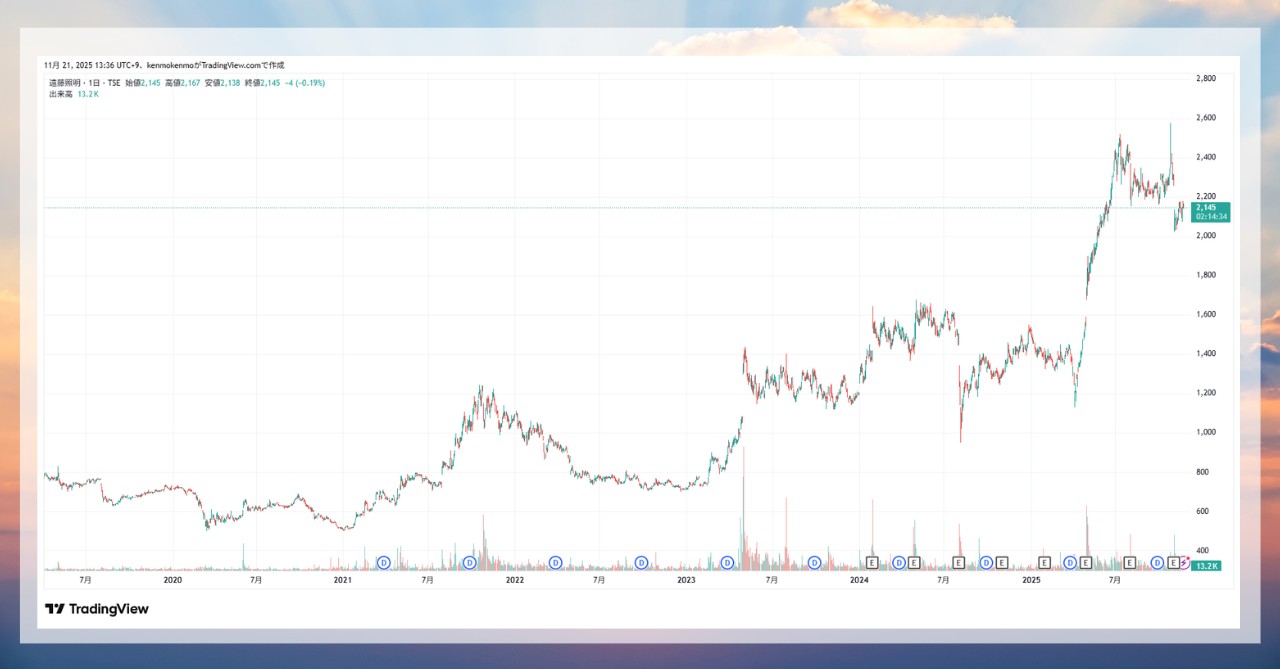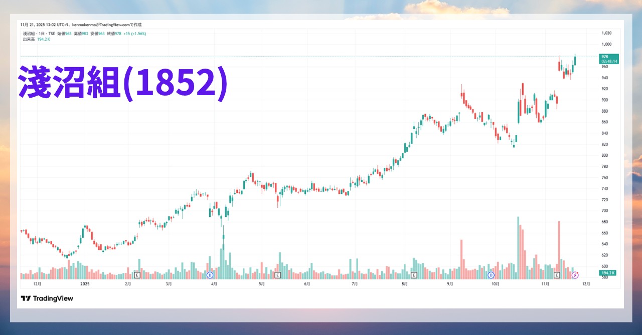 続いて、淺沼組です。半導体関連の銘柄が利益確定売りに押される中で、今回の決算で窓を開けて上げ、昨日も新高値を取ってきています。今回の決算シーズンは特に関西のゼネコンの業績が非常に良かったです。