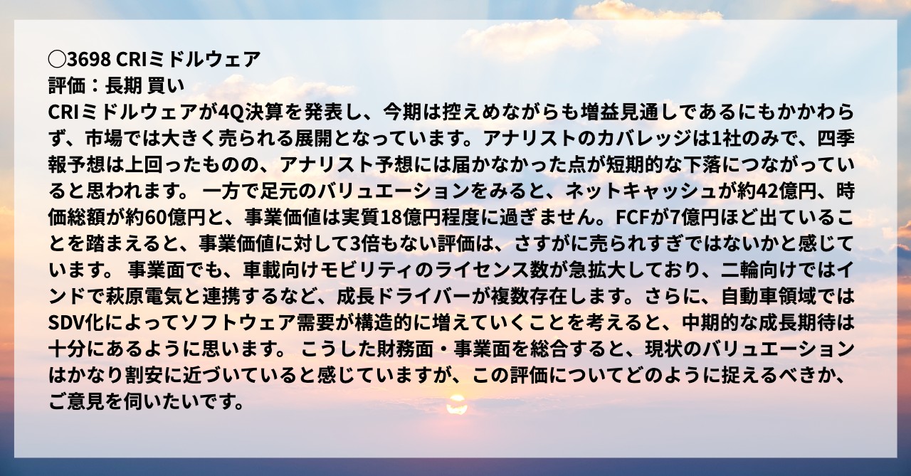 「CRI・ミドルウェアが4Q決算を発表し、今期は控えめながらも増益見通しであるにもかかわらず、市場では大きく売られる展開となっています。アナリストのカバレッジは1社のみで、四季報予想は上回ったものの、アナリスト予想には届かなかった点が短期的な下落につながっていると思われます。