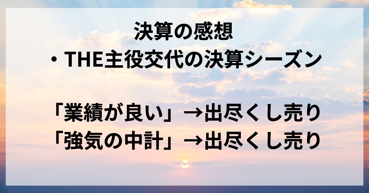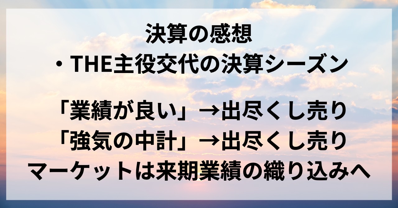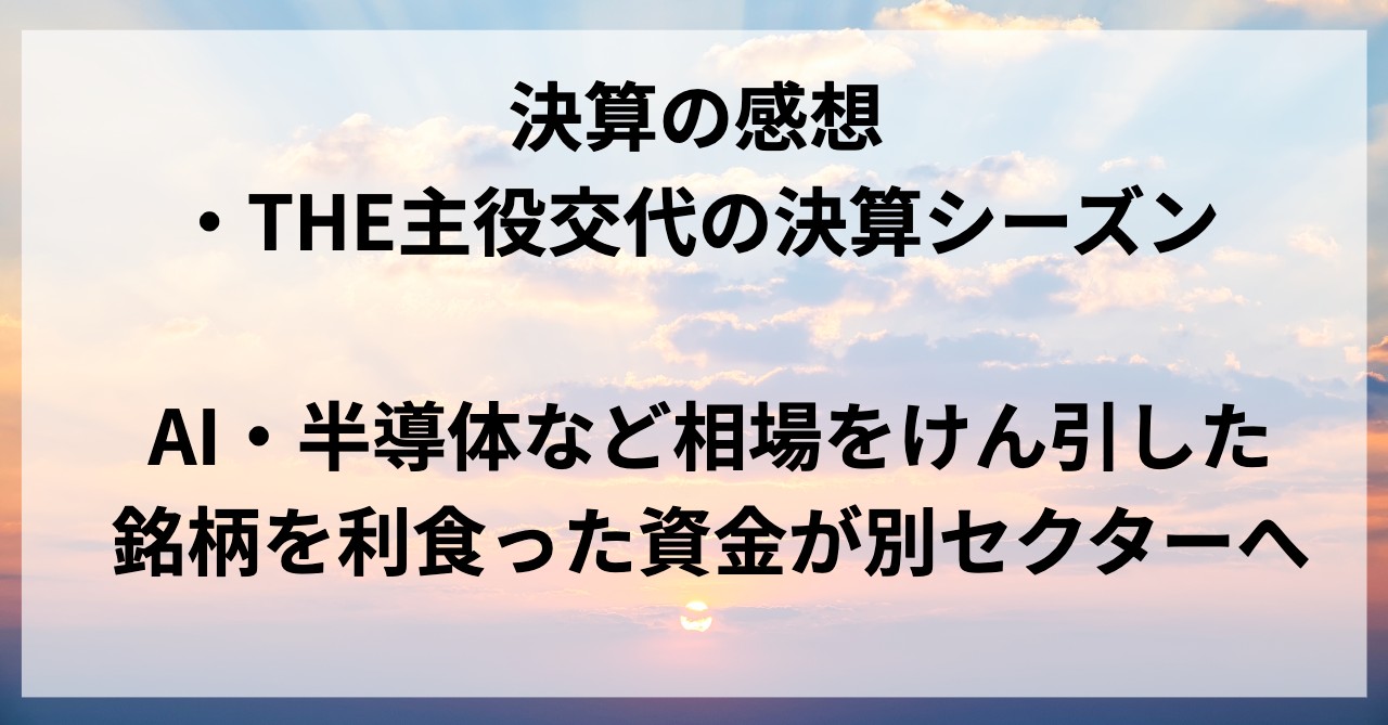 今回の決算の感想は「THE主役交代の決算シーズン」であったと思います。AIや半導体関連など、半年前ぐらいから相場をリードしてきた銘柄によって利食ったお金が、徐々にではありますが別セクターに流れているという状況かと思います。