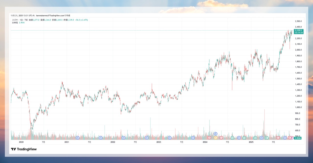チャートはすごく良いですね。トヨタ自動車など他の自動車メーカーがなかなか新高値を取っていない中で、現在スズキは新高値を取ってきており、過去最高の株価の位置にいます。やはり、コメントでいただいたような「ねじれ」があり、子会社のほうが時価総額が大きくなっているため、この株式評価だけでも本体の時価総額を超えてしまう状況です。