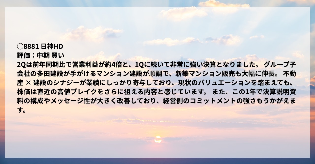 「2Qは前年同期比で営業利益が約4倍と、1Qに続いて非常に強い決算となりました。グループ子会社の多田建設が手掛けるマンション建設が順調で、新築マンション販売も大幅に伸長、不動産×建設のシナジーが業績にしっかり寄与しており、現状のバリュエーションを踏まえても株価は直近の高値ブレイクをさらに狙える内容と感じています。