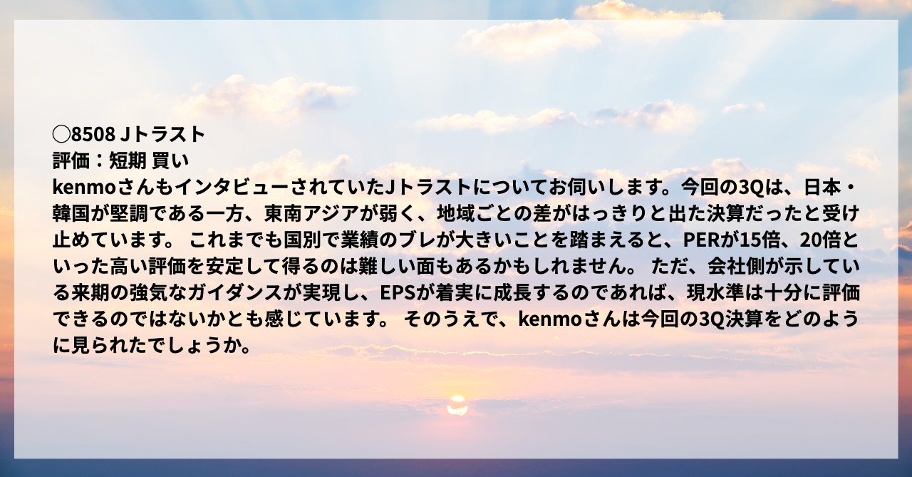 「kenmoさんもインタビューされていたJトラストについておうかがいします。今回の3Qは日本・韓国が堅調である一方、東南アジアが弱く地域ごとの差がはっきりと出た決算だと受け止めています。これまでも国別で業績のブレが大きいことを踏まえると、PERが15倍、20倍といった高い評価を安定して得るのは難しい面もあるかもしれません。