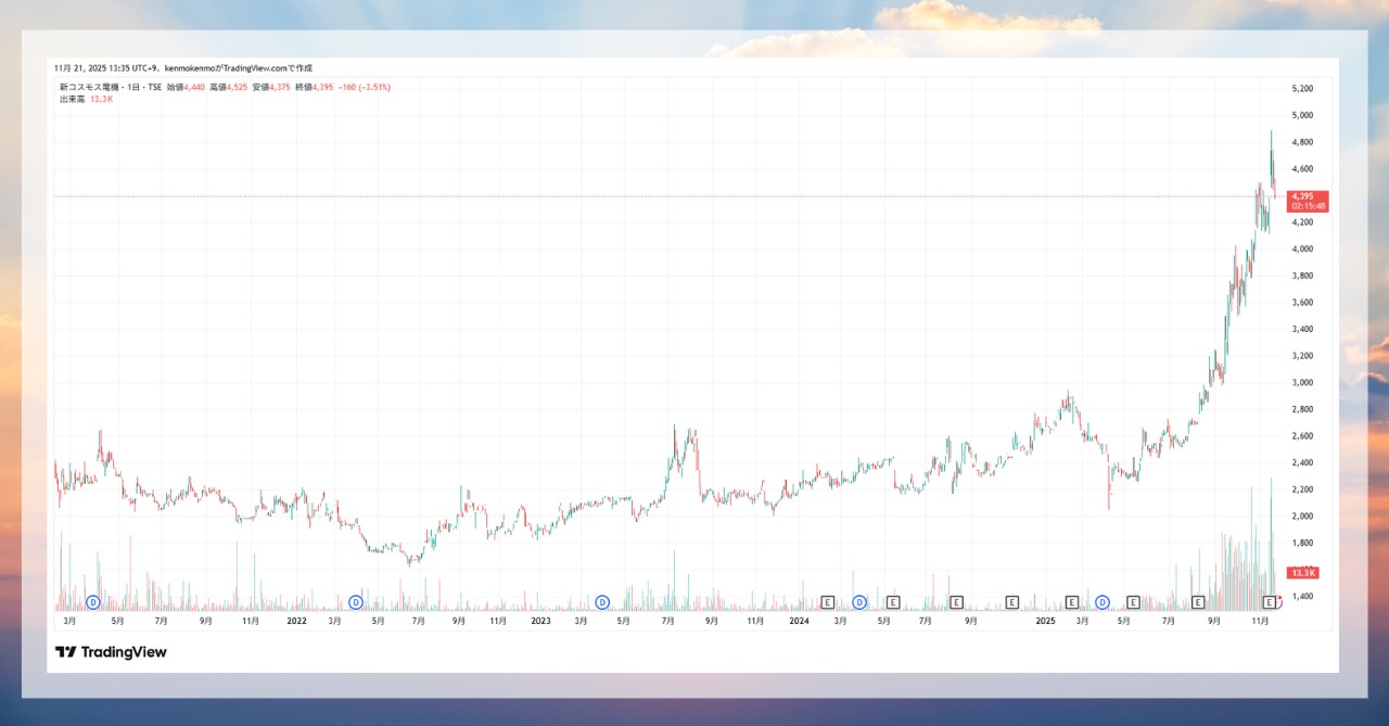 新コスモス電機は突然人気が出ましたよね。8月ぐらいに高値を抜いてきて、現在は4,000円台ぐらいです。株価は1.5倍以上になっています。