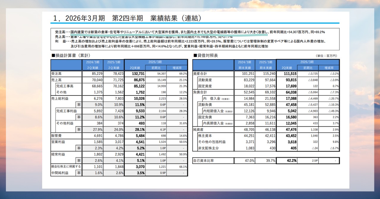 淺沼組は業績が良いだけでなく、来期に向けて足元の受注状況も非常に良いですし、仕込みもしっかりできているというニュアンスの表現が決算説明資料から見て取れます。