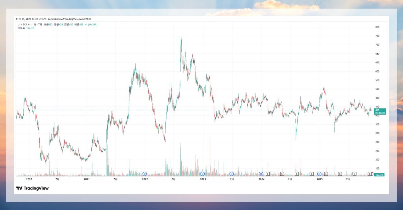 Jトラストは、株価がここ2年ぐらいずっと横ばいです。下は掘らないものの、上にも抜けないという状況で、アジアの金融マーケットがそこまで悪くはないとは思うのですが、なかなか先を見通せないというところがあります。