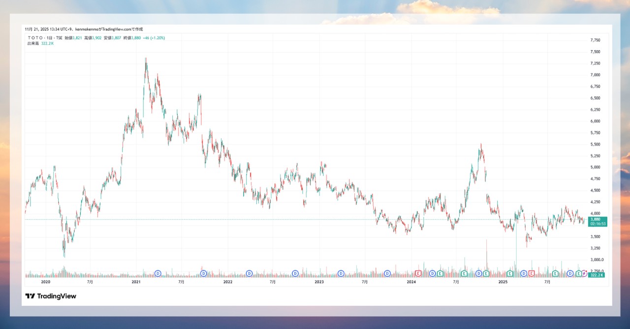 コロナショックの後に、三密を避けるために戸建てが売れて、トイレが足りないという話がありました。TOTOはそのタイミングで一度相場を張った後、中国の不動産市況が非常に悪く、トイレなどの住宅設備が中国向けに出ていかないということがあり、株価はだいぶ右肩下がりとなり、現在は下のほうに来てしまっています。