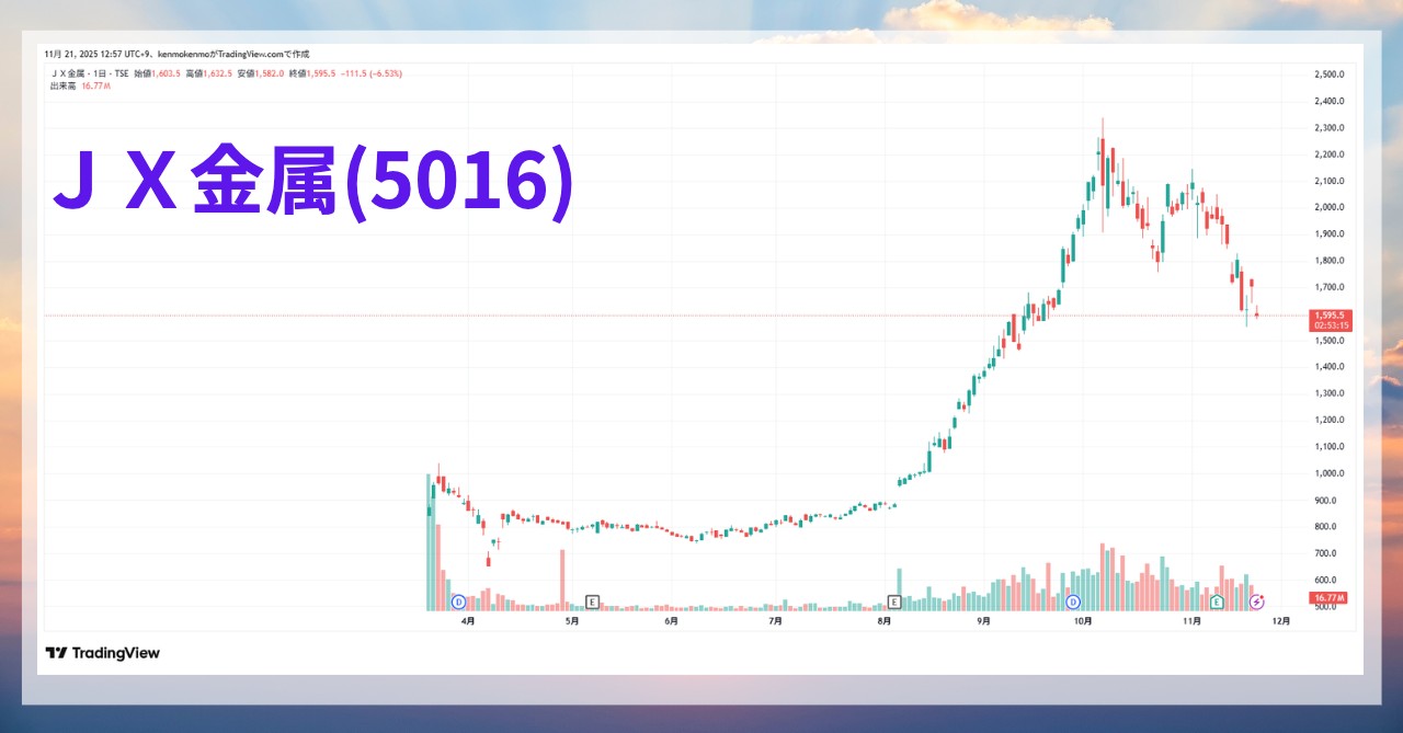 また、JX金属も8月の決算以降、非常に強かったです。連日のように陽線をつけ「ここだけ買っていればよかった」という相場から一転して、10月以降は少し軟調な相場展開となっています。押し目買いをした人たちも損切りをさせられるようなチャートの動きになっていると思います。