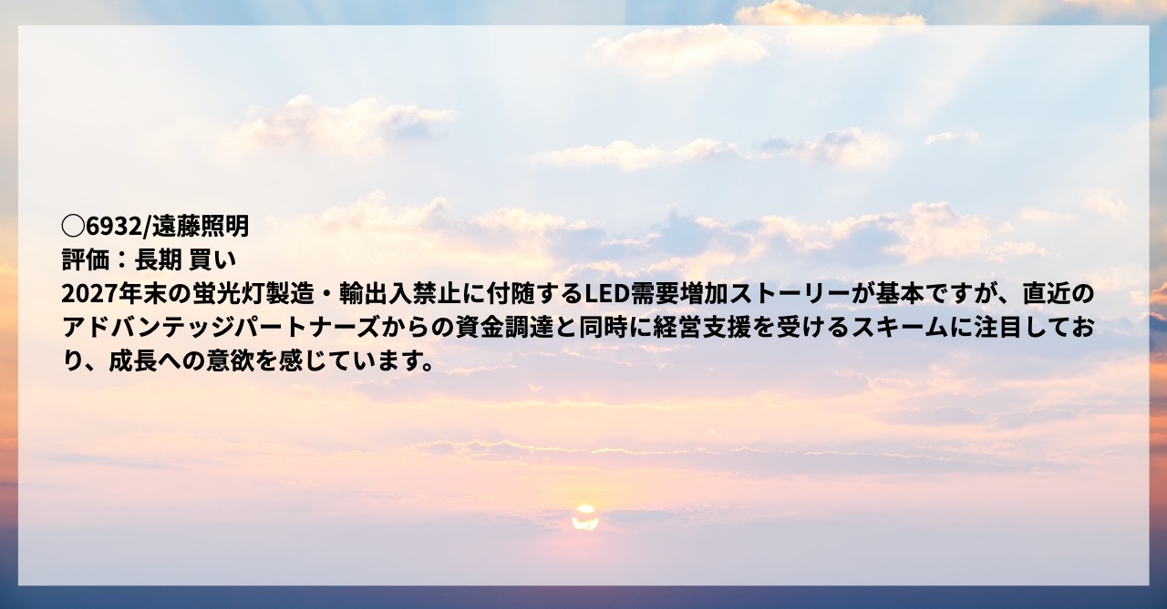 「2027年末の蛍光灯製造・輸出入禁止に付随するLED需要増加ストーリーが基本ですが、直近のアドバンテッジパートナーズからの資金調達と同時に経営支援を受けるスキームに注目しており、成長への意欲を感じています」というコメントです。