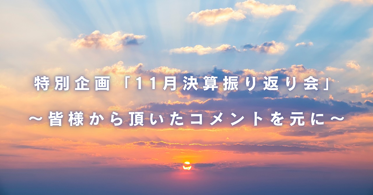 本日は11月の決算を振り返りました。最初にお話ししたとおり、今年4月からずっとマーケットは上昇基調で、少し一服というタイミングかと思います。このように一服のタイミングは、デイトレードなどでガチャガチャと動かすよりも、やはり来期や再来期、2、3年先の成長を見据えた次の仕込みを考えるタイミングかと思います。