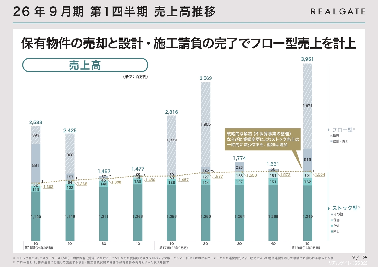 第1四半期の売上高推移です。保有物件の売却や設計・施工請負の完了により、フロー型売上が大きく計上されました。一方で、戦略的な解約や物件の業態変更に伴い、ストック型売上は第1四半期で一時的に減少しましたが、粗利は増加しています。