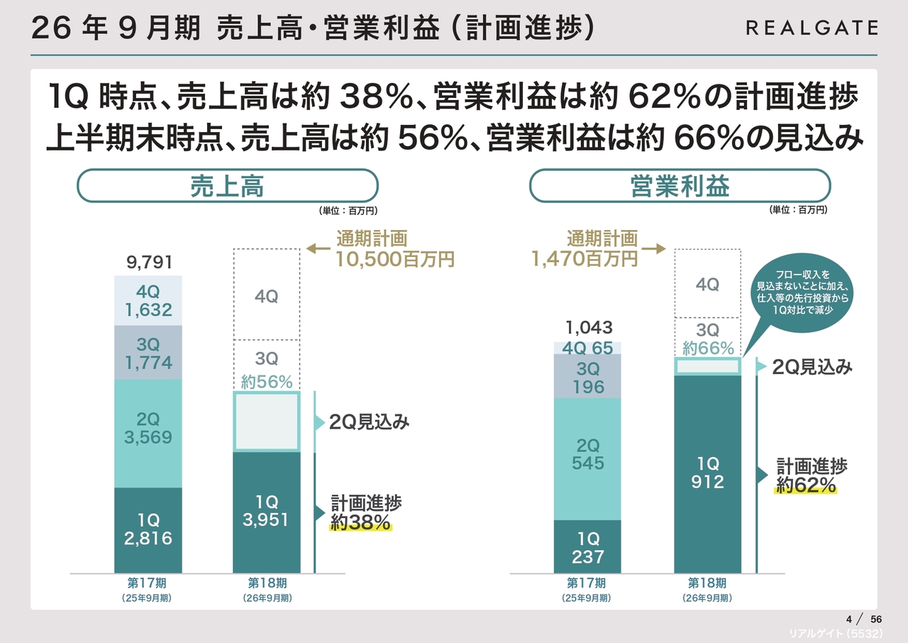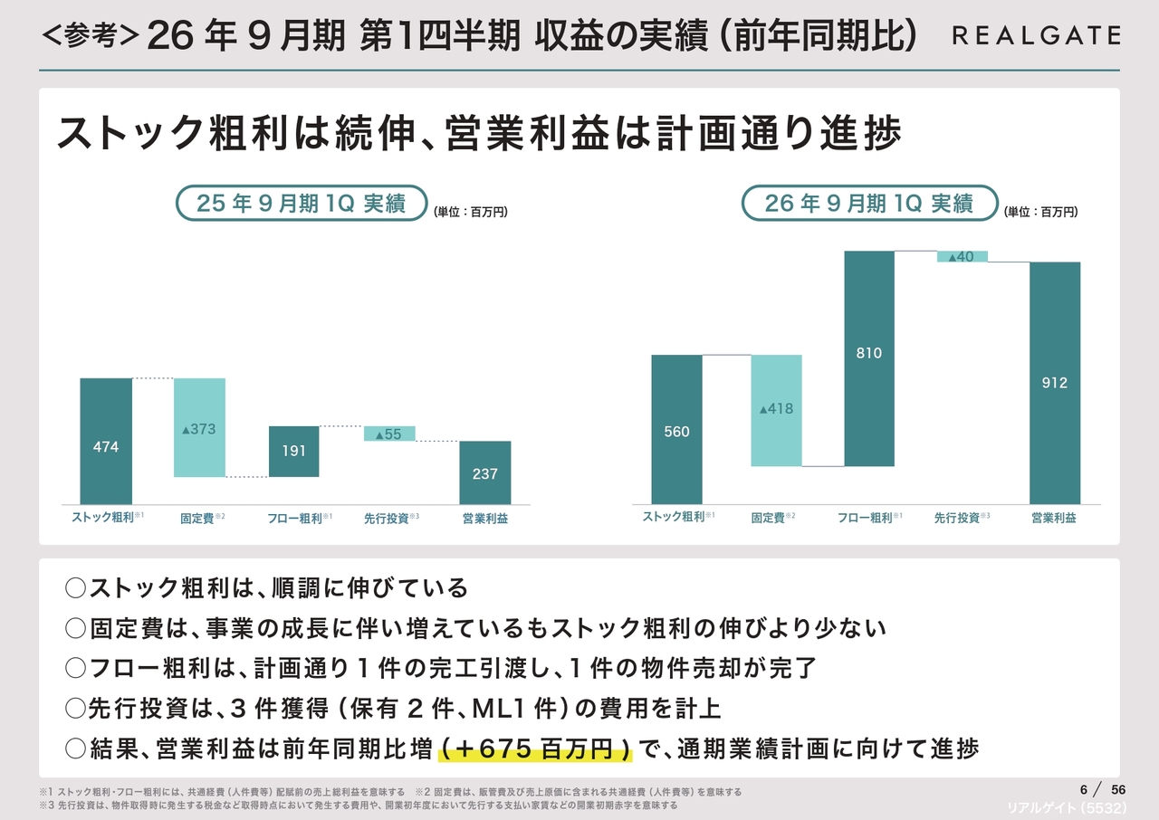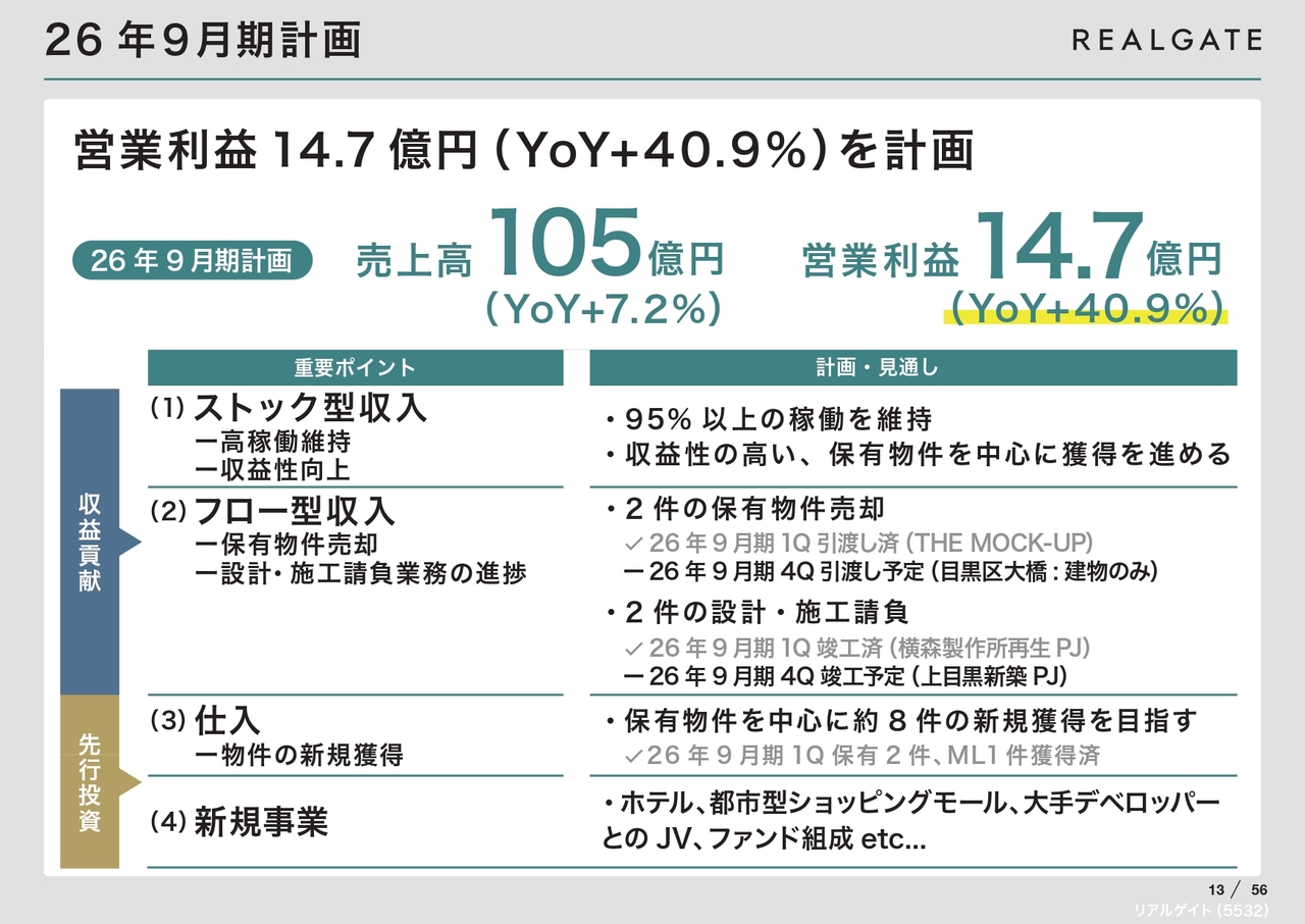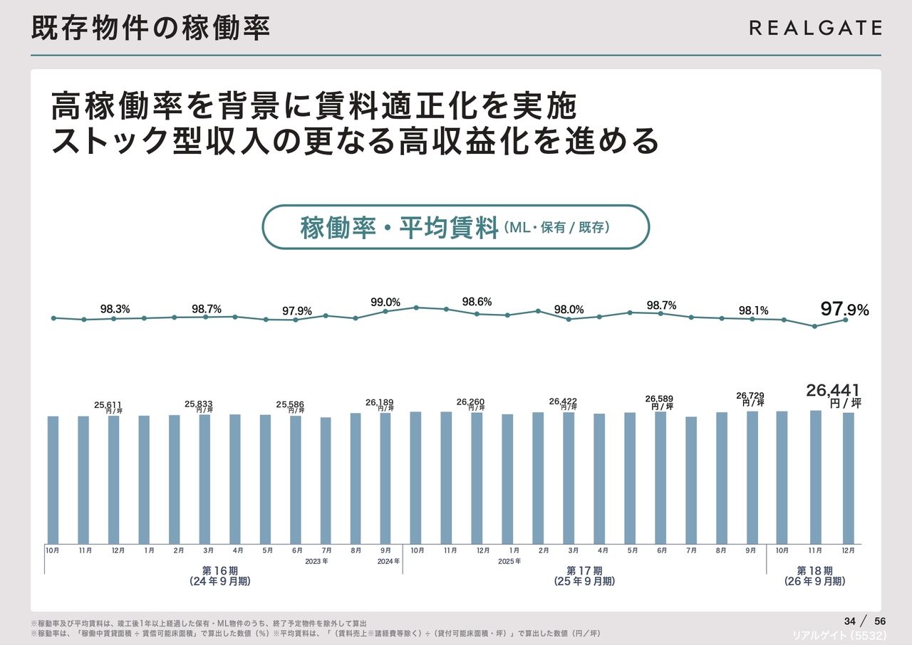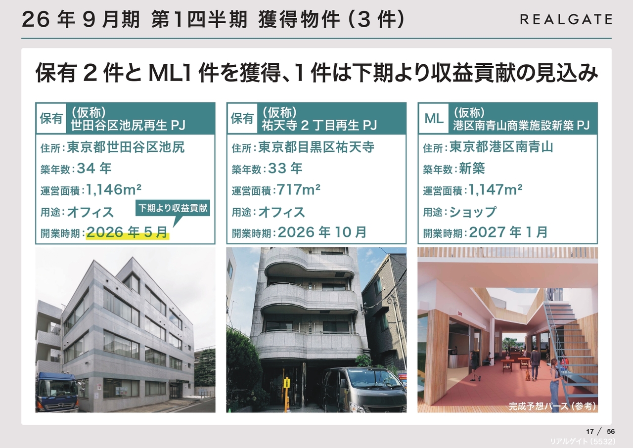 ただし、物件の入替えや保有物件の増加により、収益は着実に上がっています。売上についても一時的な要因によるものですので、今期(2026年9月期)第2四半期以降には回復する見込みです。