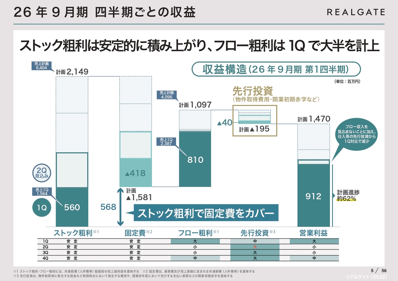 四半期ごとの収益です。ストック粗利は順調に積み上がっており、これにより固定費を賄えています。また、第1四半期にフロー粗利の大半が計上されました。その結果、営業利益は計画比で約62パーセントの進捗となりました。