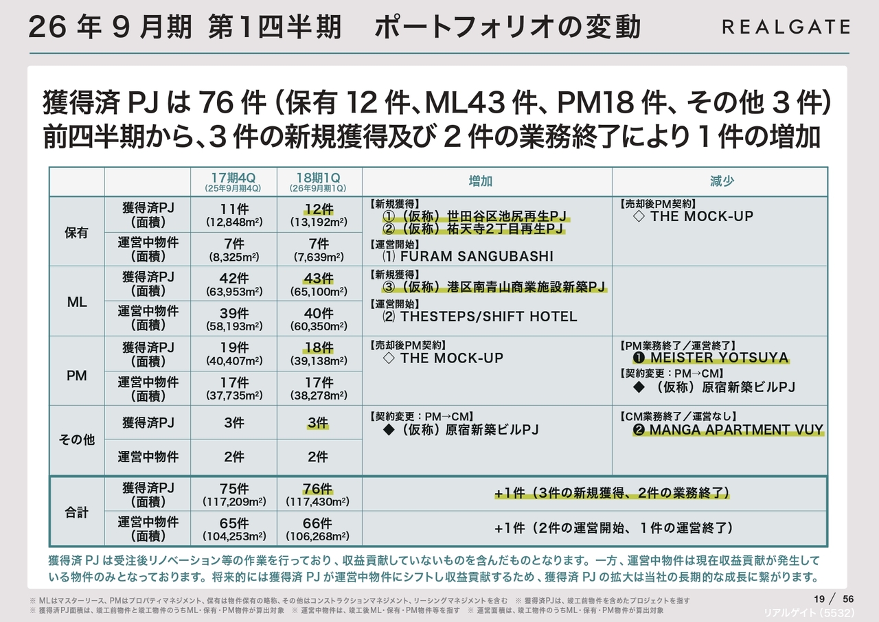ポートフォリオの変動についてです。獲得済物件は76件です。前四半期から3件の新規獲得、2件の業務終了があり、1件の純増となりました。今後も収益性の高い保有物件およびML(マスターリース)物件の増加を目指し、物件の入替えを進めていきます。