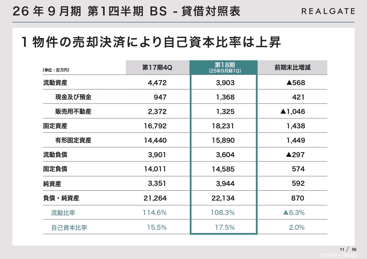 第1四半期のBS(貸借対照表)です。1物件の売却が完了したことにより、自己資本比率が上昇しました。