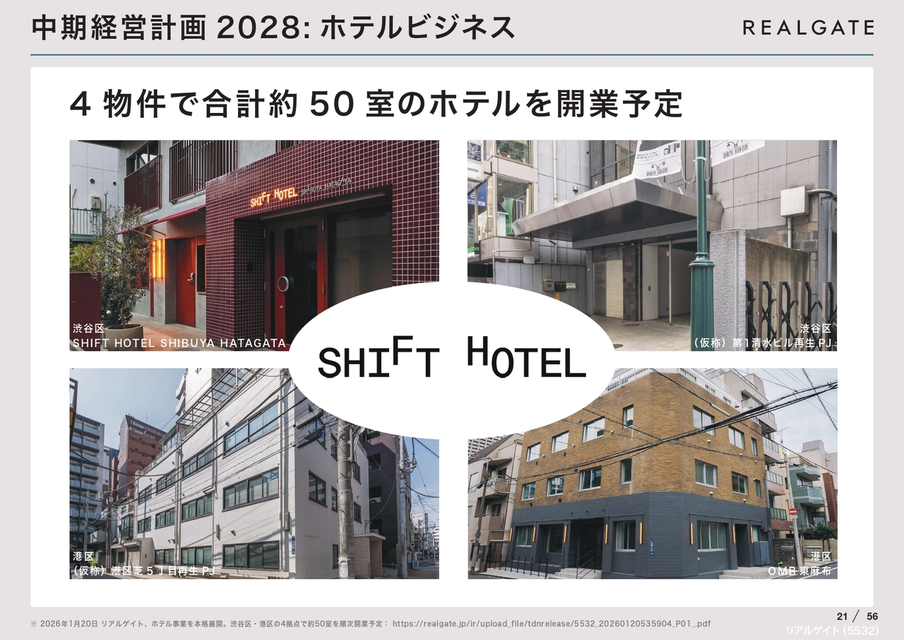 ホテルビジネスについてです。中期経営計画を達成するために、ホテルの開業を控えています。4物件で合計約50室を開業する予定です。
